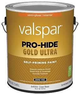 Valspar Pro-Hide Gold Ultra Paint smooth, uniform finish, good hide and coverage. Durable formula. Zero VOC. Self priming for dependable coverage. Even application with spray, brush & roller. Excellent touch-up.